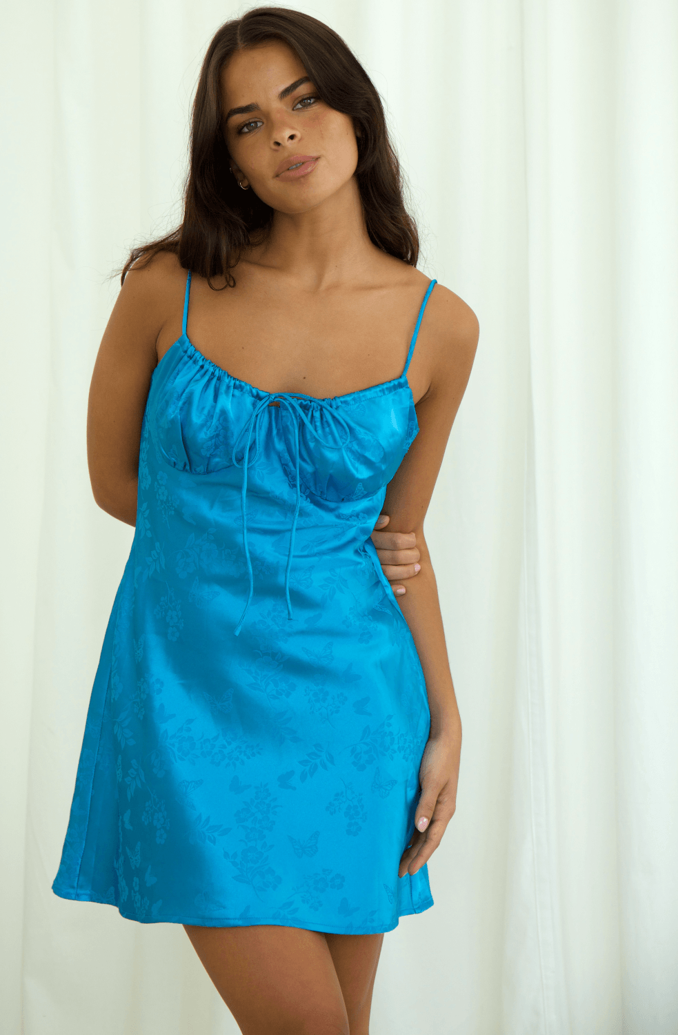 Introducing the perfect dress for a night of jaw-dropping fashion: the Adrianna satin mini dress! This maxi dress has a fitted bodice with a tie-bust to show off your curves, while the bias cut and a-line silhouette make you look like a dream. Not to mention its glossy satin fabric, intricate floral jacquard pattern, and a pop of color make it the perfect dress for a spring wedding, formal, or date night!