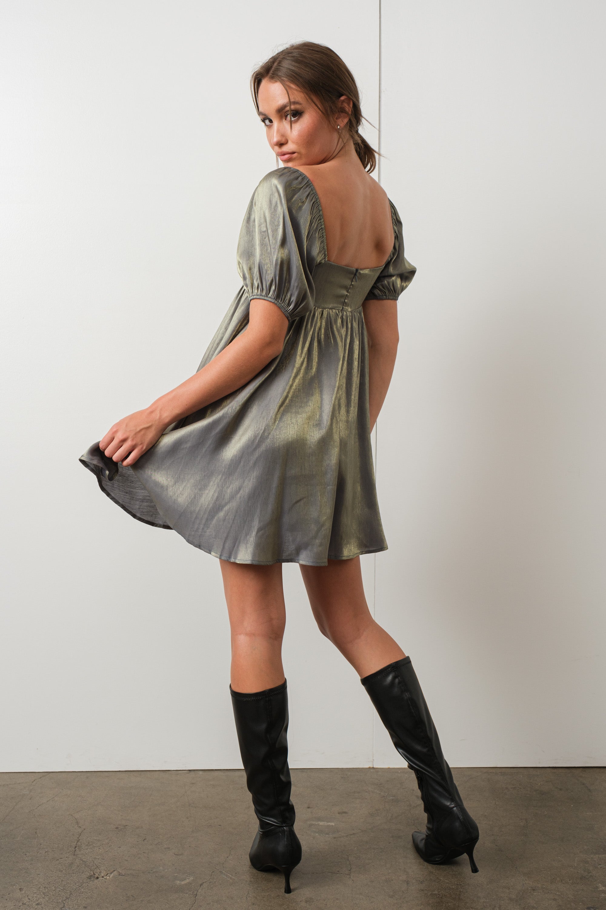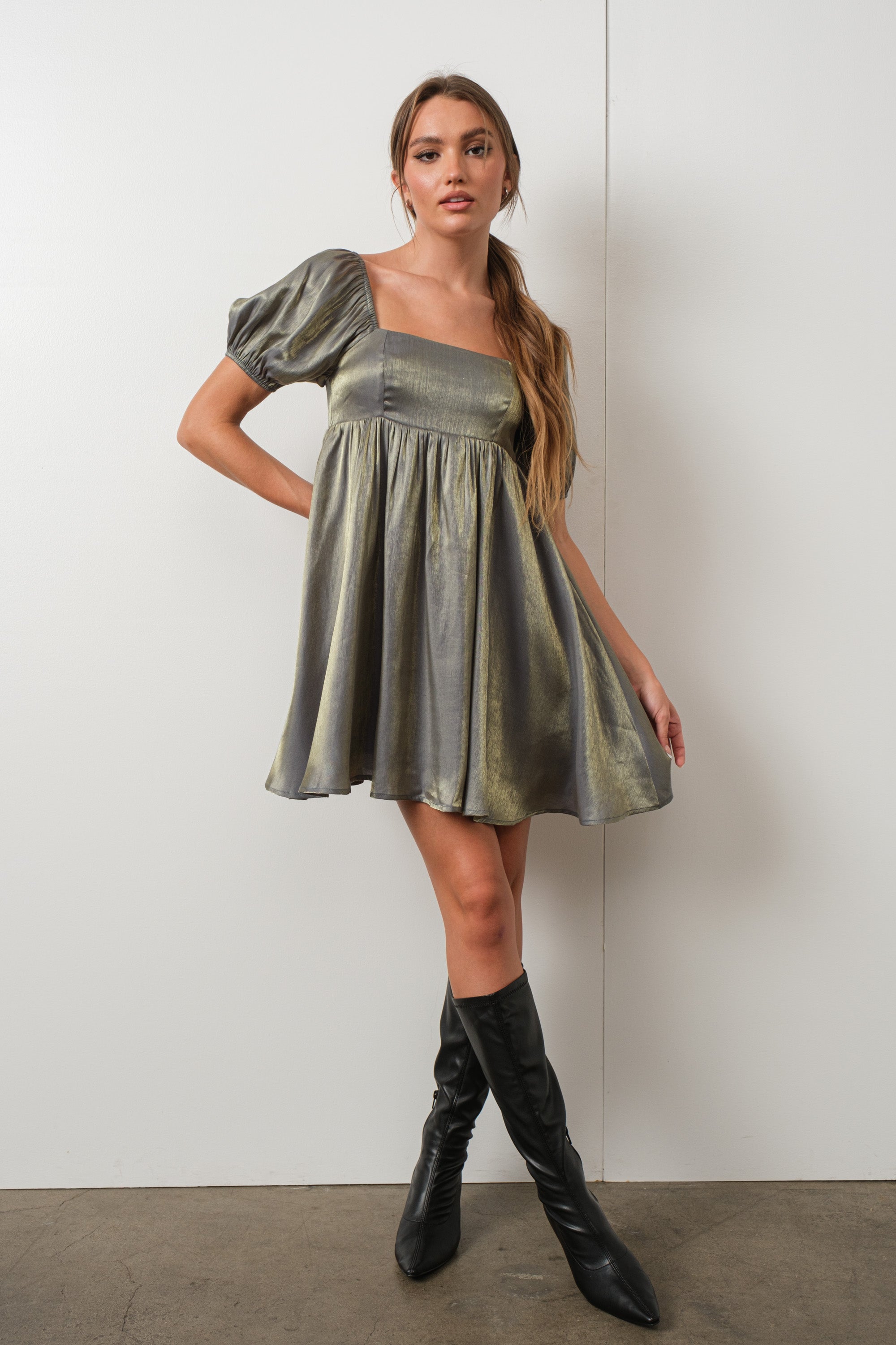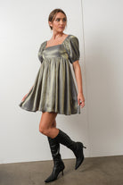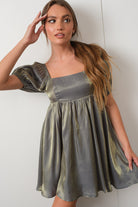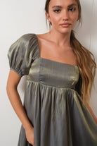 Fall in love with this Arela Shimmer Babydoll Dress! Perfect for any special event, this sagey green stunner will shimmer and shine like no one's business with its golden tint. It's a showstopping pick with its babydoll silhouette and puff sleeves—talk about wow factor! Get ready to have everyone swooning.