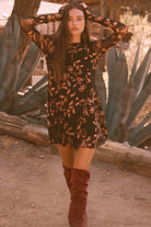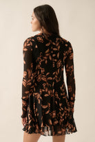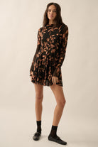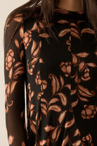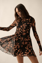 Get ready to turn heads in this floral-patterned mesh swing dress! It boasts a mock-neck collar, thumb-hole sleeves, and a full skirt with godet pleats. The bodice has princess seams and the cuffs and hem feature a playful lettuce-edge finish. A sleeveless lining and thigh length make this dress perfect for any occasion. Plus, with its relaxed fit, you'll be comfortable and stylish all day long.