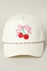 Add a playful twist to your everyday look with this adorable cherry cap! Featuring embroidered twin cherries tied with a pink ribbon and finished with a colorful braided trim, this hat brings just the right amount of cute to any outfit. Pair it with your favorite tee and denim for the perfect laid-back vibe.