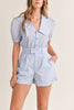 Get ready to turn heads in this playful and stylish Striped Cute Collared Romper! Made from 100% cotton poplin, this romper features short puff sleeves, a sharp collar, and a short lining for added comfort. Perfect for any occasion!