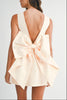 Turn heads in this statement mini dress featuring a dramatic oversized bow at the back. Designed with a sleek square neckline and sleeveless silhouette, this satin dress offers a structured fit that flatters your shape. The deep V-back adds a touch of elegance and allure, making it a perfect pick for cocktail parties, weddings, or any special occasion.