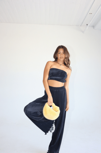 - Plisse Bra Tube Top and Waist Wide Leg Pant Set