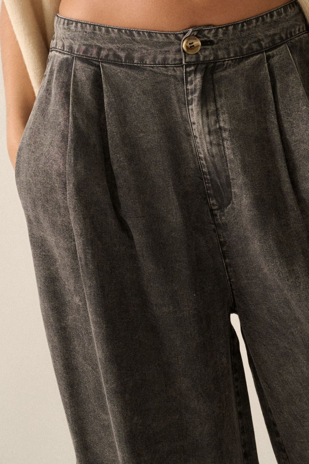 The Collister Mineral Washed Denim Pleated Wide-Leg Pants are the perfect combination of style and comfort! Featuring a pleated front, side seam pockets, and a waist button closure with a zip-up fly, these pants offer both convenience and fashion. The wide-leg design and elastic-back waist provide a loose fit that will keep you feeling free and fabulous all day long!