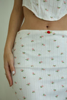 Get ready to bloom in the Rose Knit Set! This charming duo features a pointelle corset top and midi skirt, crafted from a super soft knit for ultimate comfort. With a delicate small floral print and tiny rose appliqué details, this set is perfect for adding a touch of fem chic to your wardrobe.