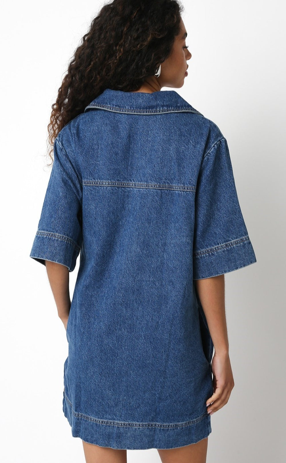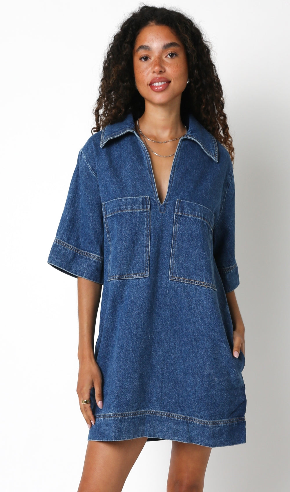 Introducing the ultimate in chic and versatile fashion - the Addy Denim Dress. Made with high quality denim, this dress features a v neckline, collar, and a structured a-line silhouette for the perfect fit. Complete with a large pocket details for added elevation. this dress is limitless when it comes to styling.