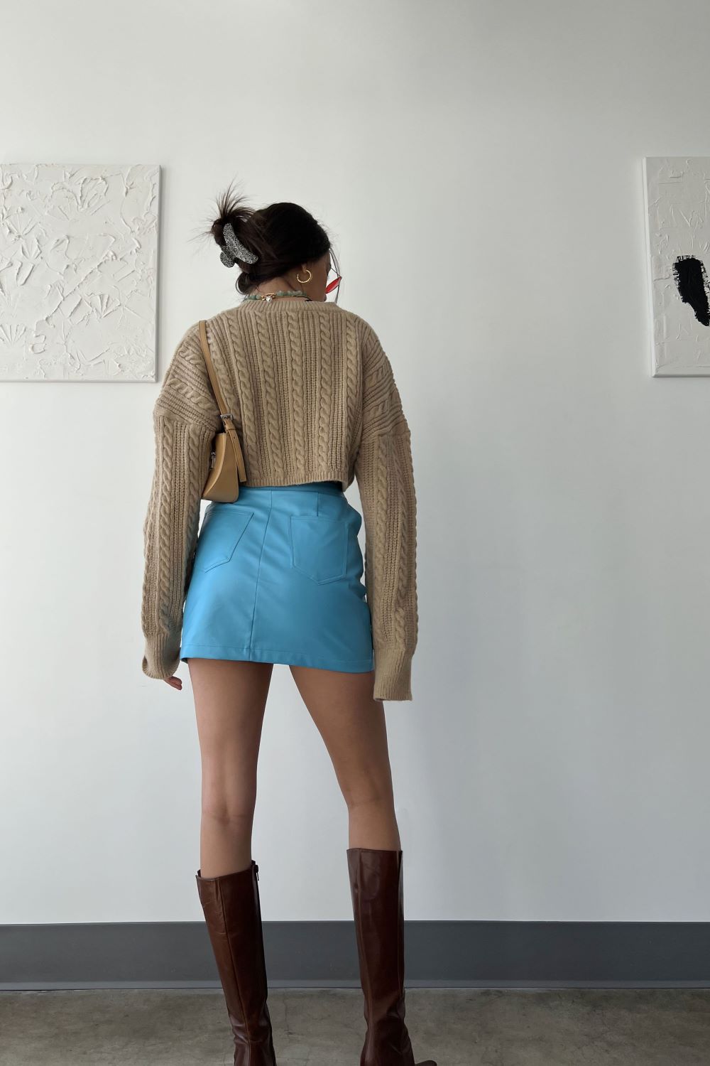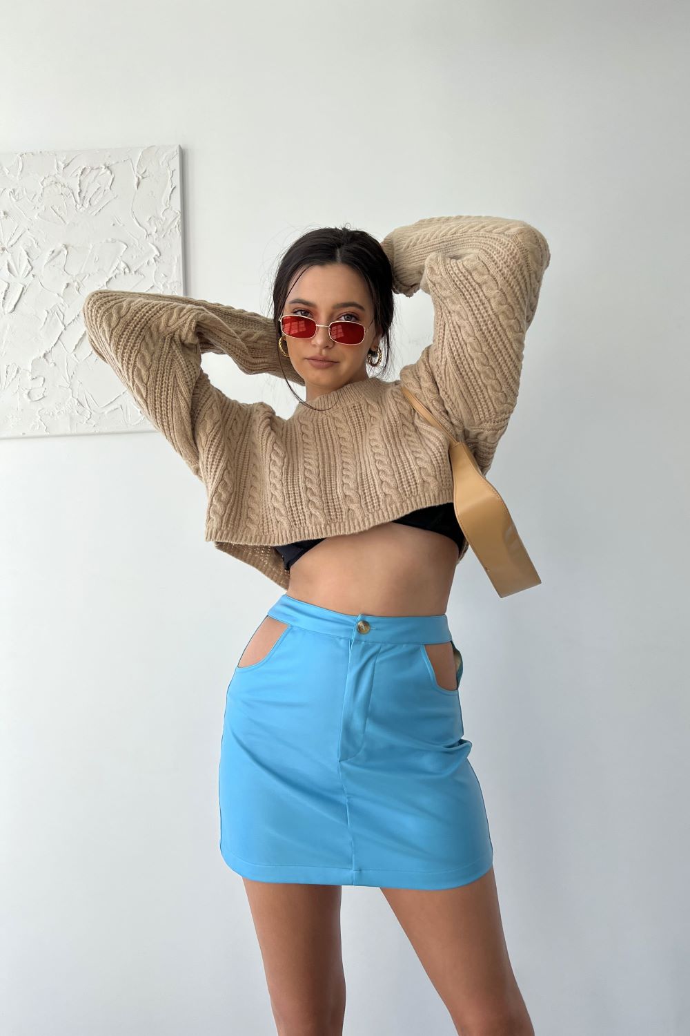 Add a playful pop of color to your wardrobe with this Azure cutout skirt! Featuring flattering side cutouts and faux leather fabric, it's the perfect mix of edgy and chic. Slay the it girl look by pairing with your favorite sweater for the ultimate cool-girl ensemble. Ready to make a statement? Rock this skirt and watch heads turn!