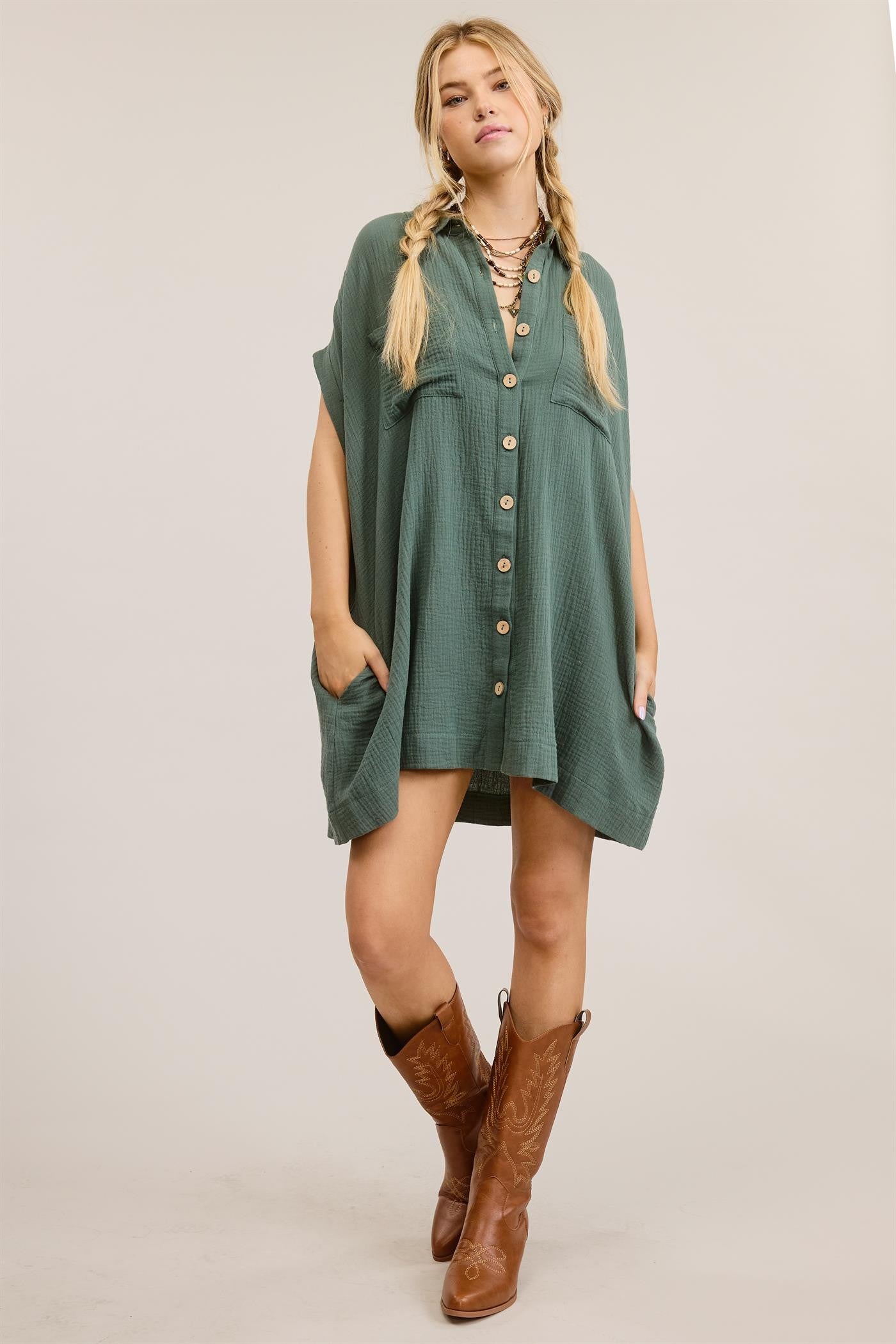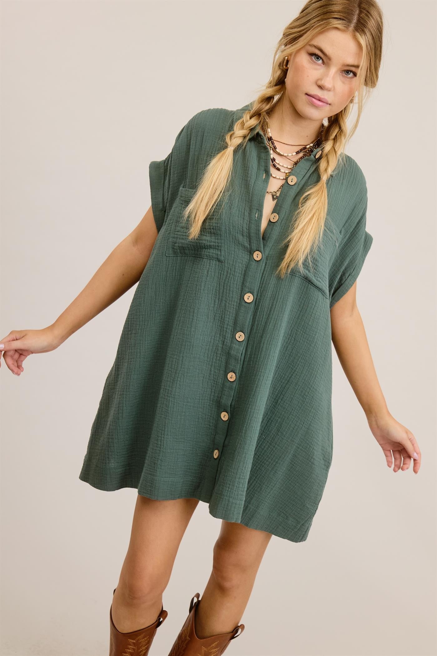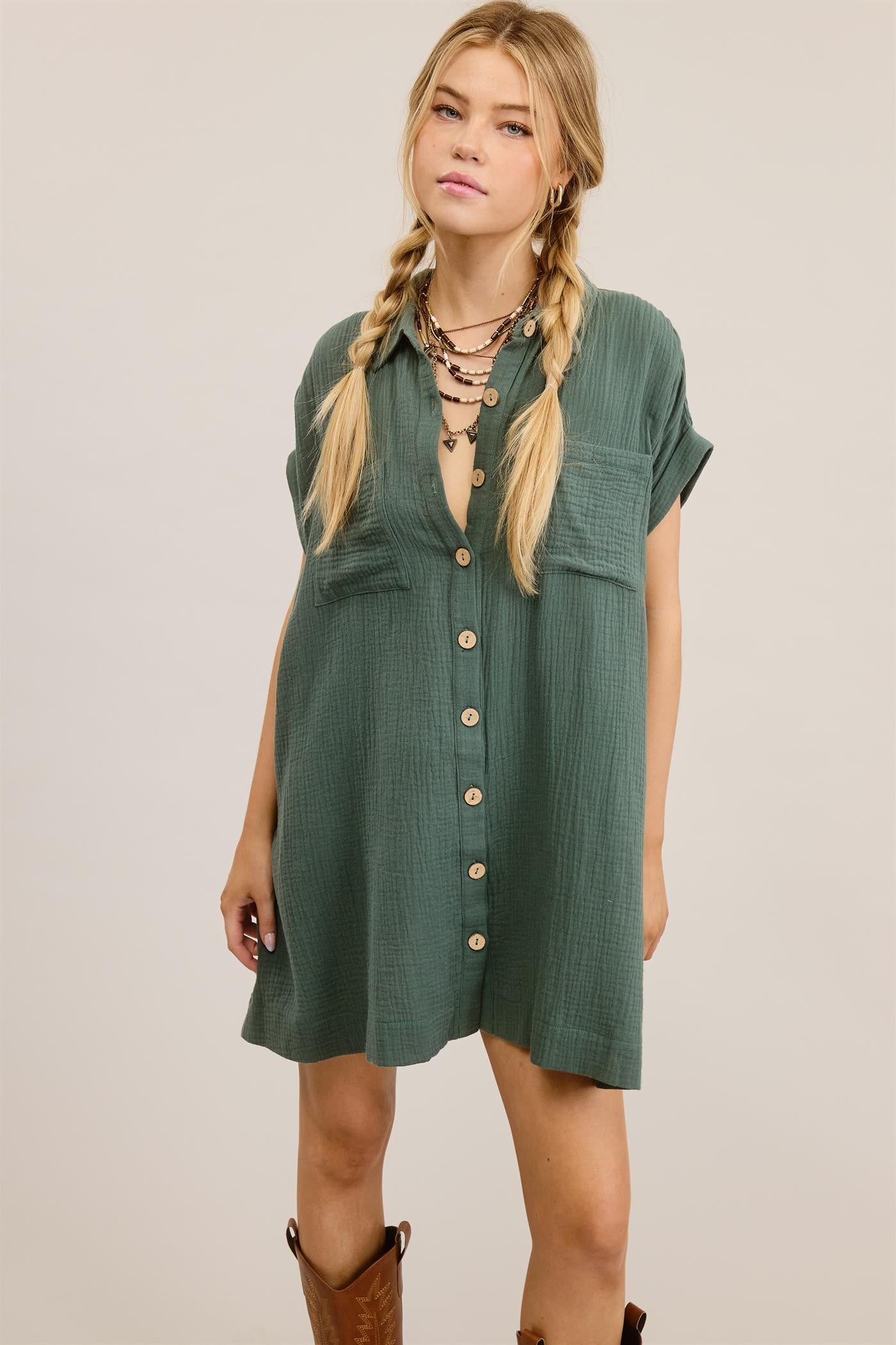 Look cute but get ready easy in Minetta: a flowy, comfy short-sleeve mini dress, crafted from a solid-gauze fabric. It boasts a collar, two pockets on the front and sides, a button-down front, and a laid-back, mini-length silhouette.